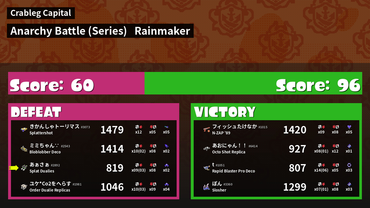 | Medals | Record-Score Setter #1 Splat Assister #1 Rainmaker Stopper | ||