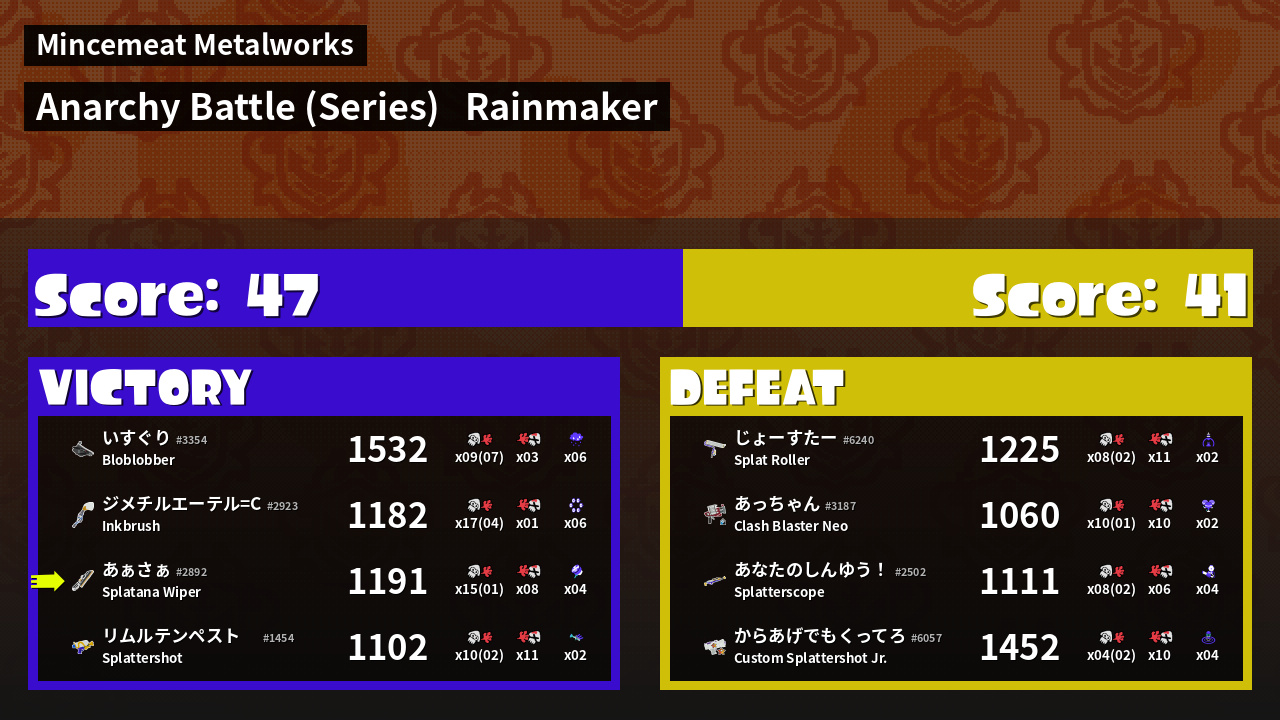 | Medals | #1 Popular Target #1 Enemy Splatter #1 Rainmaker Stopper | ||