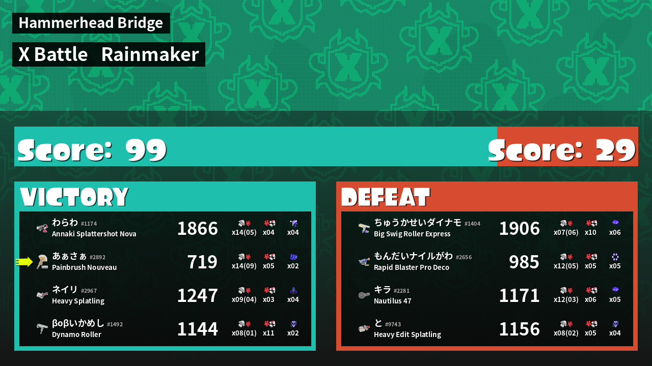 | Medals | #1 Overall Splatter #1 Splat Assister #1 Ink Consumer | ||