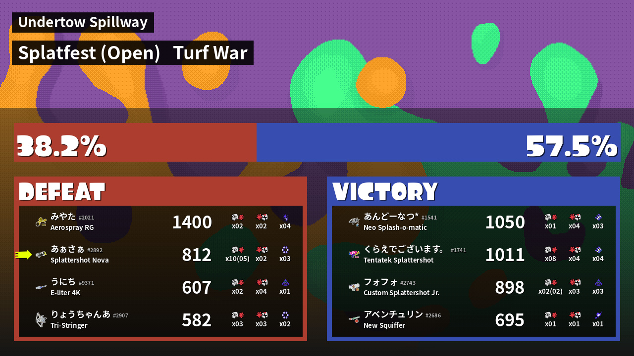 | Medals | #1 Overall Splatter #1 Home-Base Inker #1 Enemy Splatter | ||