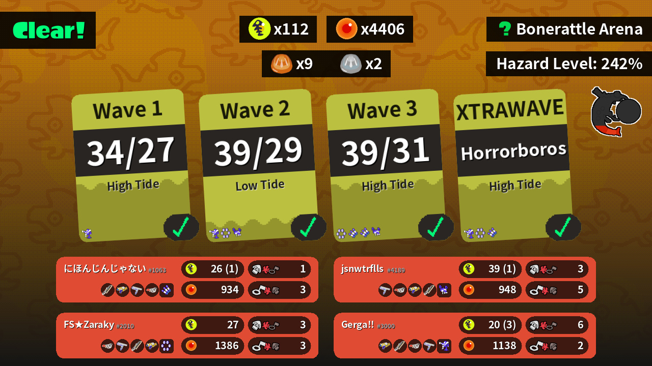 | Weapons | Splatana Wiper Splattershot Big Swig Roller Goo Tuber | Big Swig Roller Goo Tuber Splattershot Splatana Wiper | Goo Tuber Big Swig Roller Splatana Wiper Splattershot | Splattershot Splatana Wiper Goo Tuber Big Swig Roller |