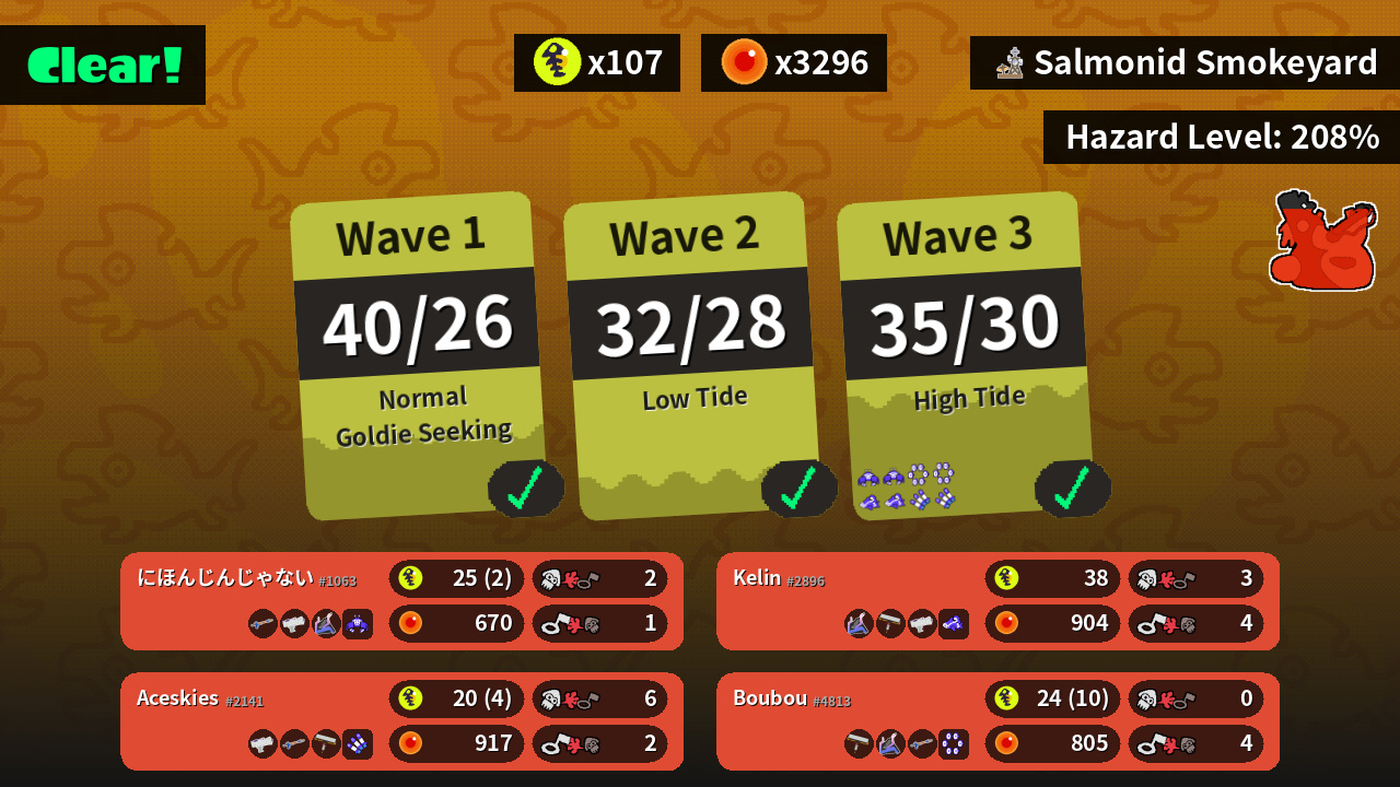 | Weapons | Snipewriter 5H Splattershot Jr. Slosher | Slosher Carbon Roller Splattershot Jr. | Carbon Roller Slosher Snipewriter 5H | Splattershot Jr. Snipewriter 5H Carbon Roller |