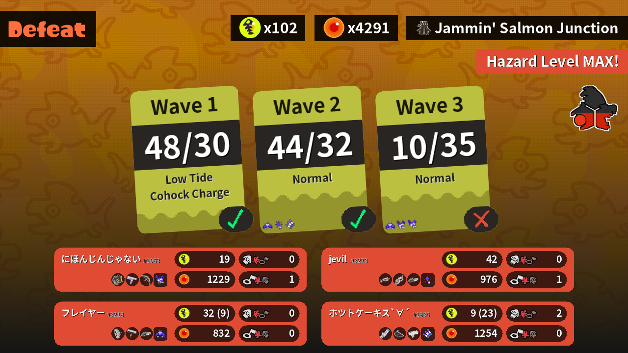 | Weapons | Grizzco Slosher Big Swig Roller Tenta Brella | Grizzco Charger Dark Tetra Dualies Ballpoint Splatling | Grizzco Stringer Carbon Roller Ballpoint Splatling | Mint Decavitator Bloblobber Splattershot Jr. |