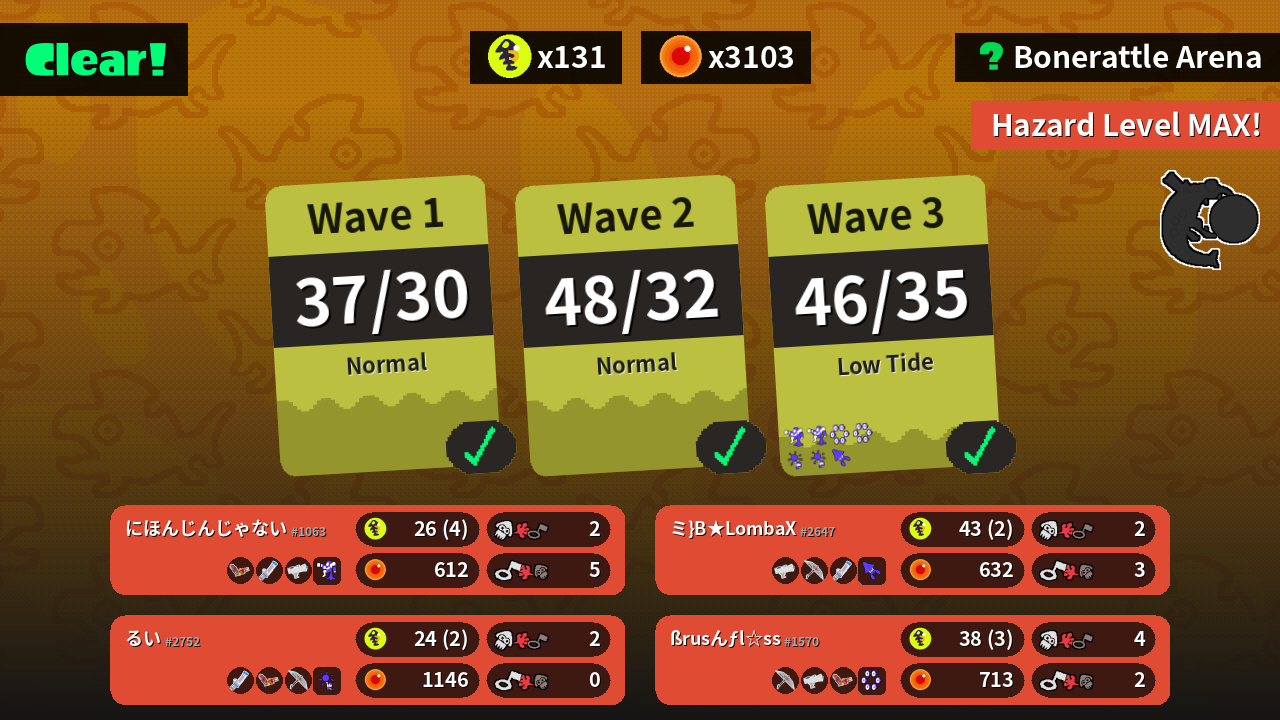 | Weapons | Hydra Splatling Mint Decavitator Splattershot Jr. | Splattershot Jr. Splat Brella Mint Decavitator | Splat Brella Splattershot Jr. Hydra Splatling | Mint Decavitator Hydra Splatling Splat Brella |