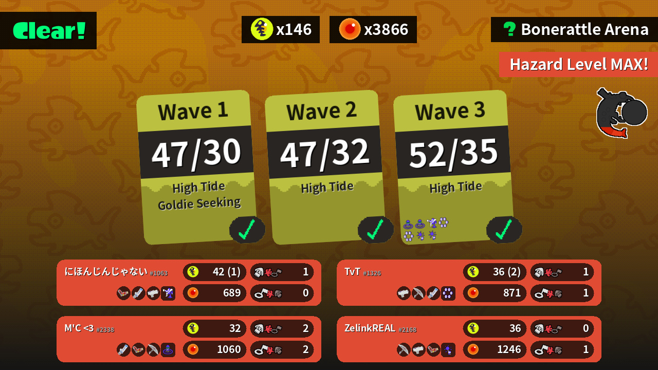 | Weapons | Hydra Splatling Mint Decavitator Splattershot Jr. | Splat Brella Splattershot Jr. Hydra Splatling | Splattershot Jr. Splat Brella Mint Decavitator | Mint Decavitator Hydra Splatling Splat Brella |