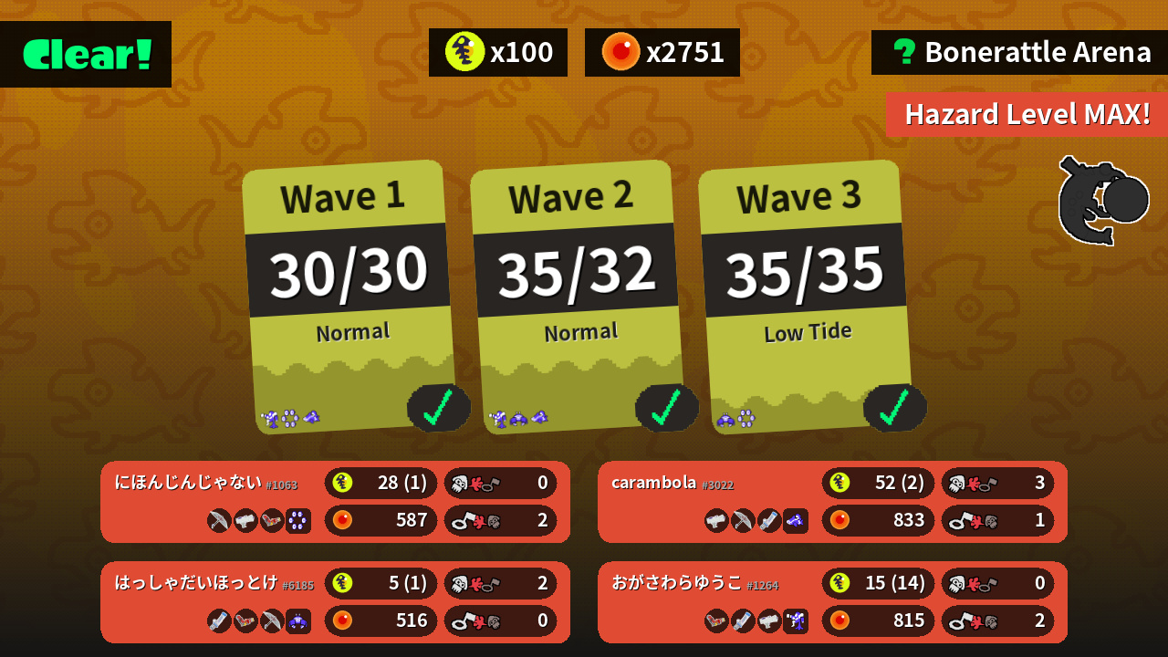 | Weapons | Splat Brella Splattershot Jr. Hydra Splatling | Splattershot Jr. Splat Brella Mint Decavitator | Hydra Splatling Mint Decavitator Splattershot Jr. | Mint Decavitator Hydra Splatling Splat Brella |