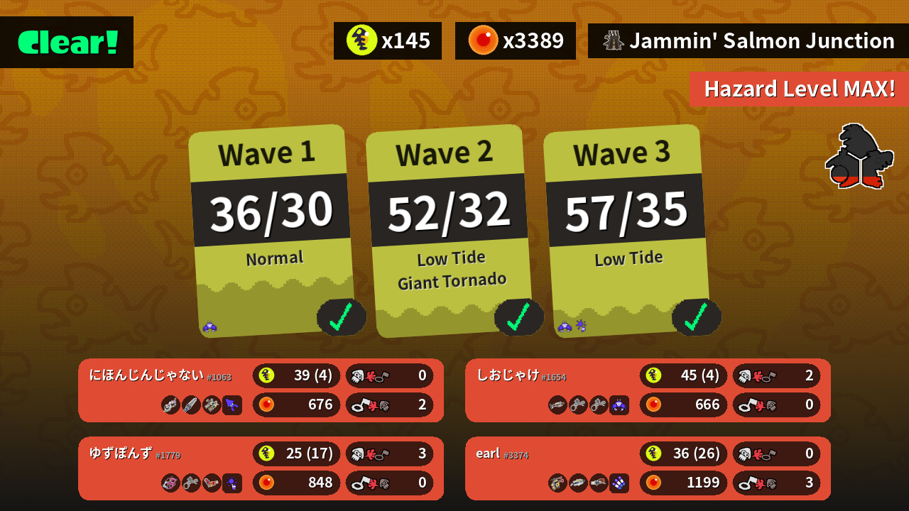 | Weapons | Dark Tetra Dualies Splatana Stamper Grizzco Dualies | Grizzco Charger Aerospray MG Aerospray MG | Douser Dualies FF Grizzco Brella Range Blaster | Dapple Dualies Aerospray MG Hydra Splatling |