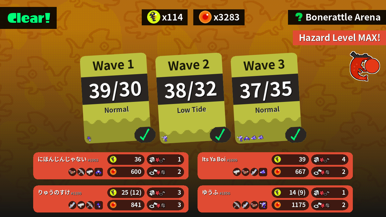 | Weapons | Hydra Splatling Splat Brella Splattershot Jr. | Splattershot Jr. Hydra Splatling Mint Decavitator | Mint Decavitator Splattershot Jr. Splat Brella | Splat Brella Mint Decavitator Hydra Splatling |