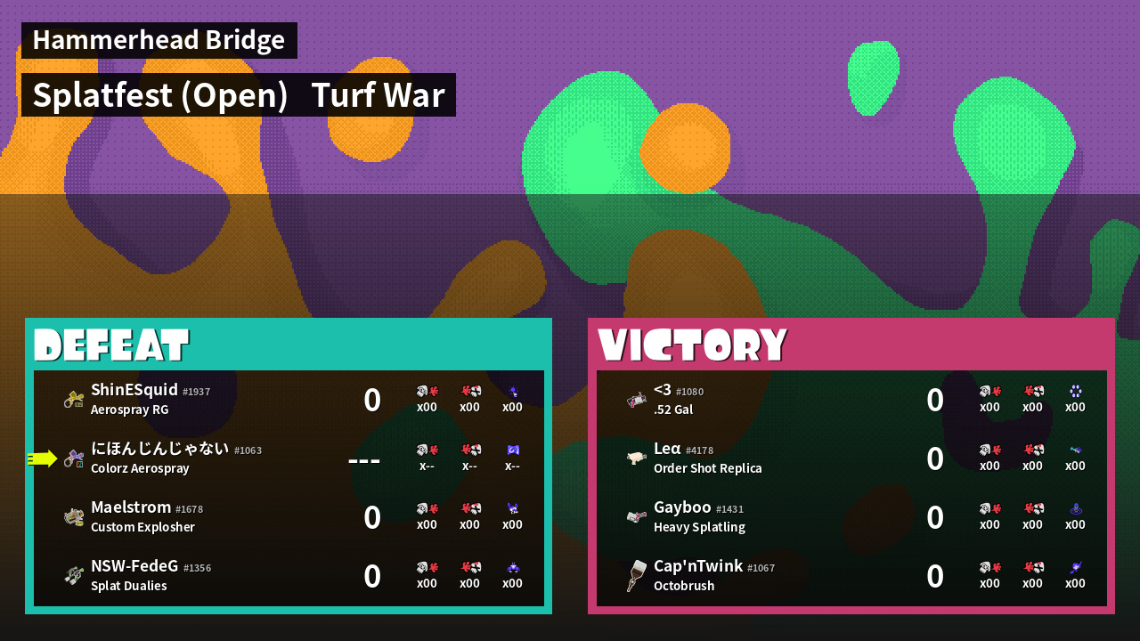 | Zesty Ghost  Gayboo #1431 |  Heavy Splatling                    | 0 | 0 + 0 | 0 | 1.00 |  0 | |