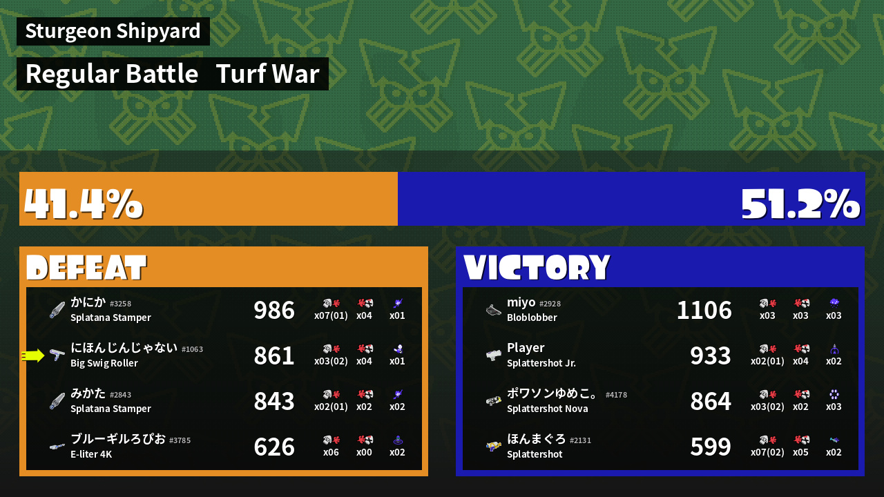 | Medals | #1 Enemy-Base Inker #1 Splat Assister #1 Damage Taker | ||