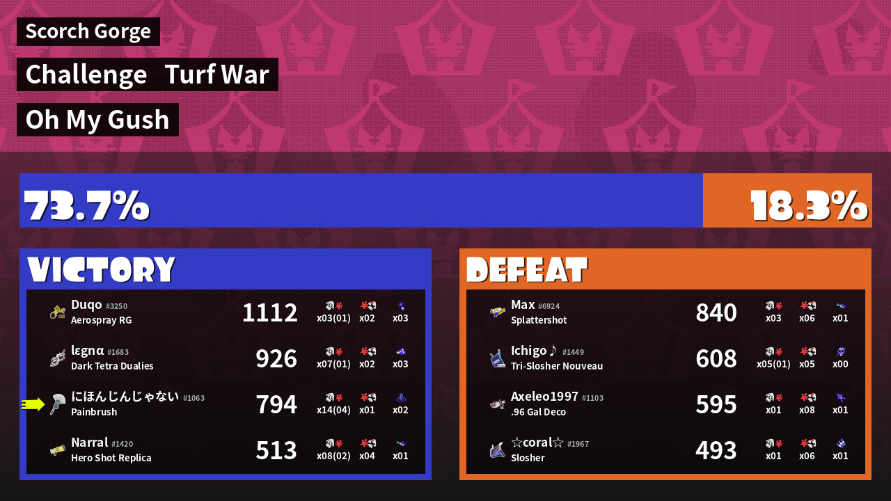 | Medals | #1 Overall Splatter #1 Popular Target #1 Enemy-Base Inker | ||