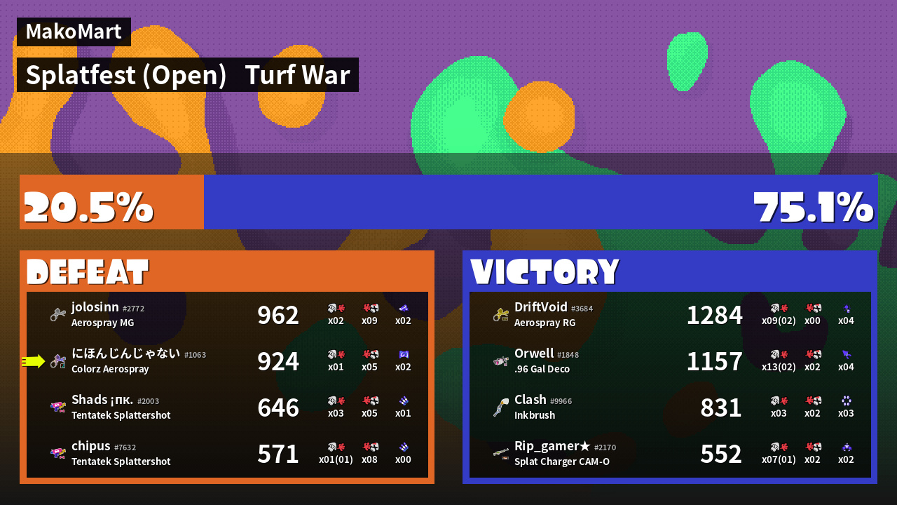 | Splatoon Camper  DriftVoid #3684 |  Aerospray RG                    | 1,284 | 7 + 2 | 0 | 99.99 |  4 | |
