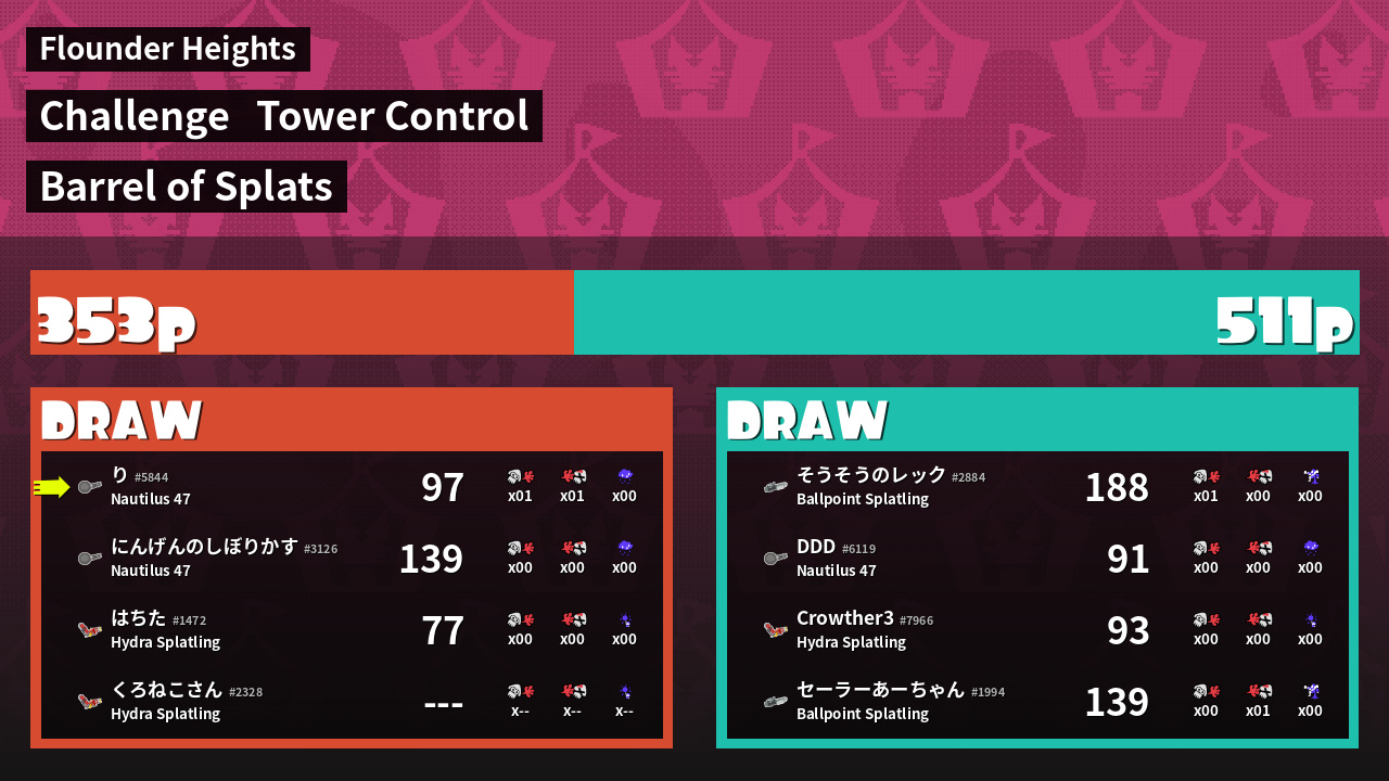 Challenge | Barrel of Splats Muster as much firepower as you can<br />in this battle of the splatlings! | ||||||||