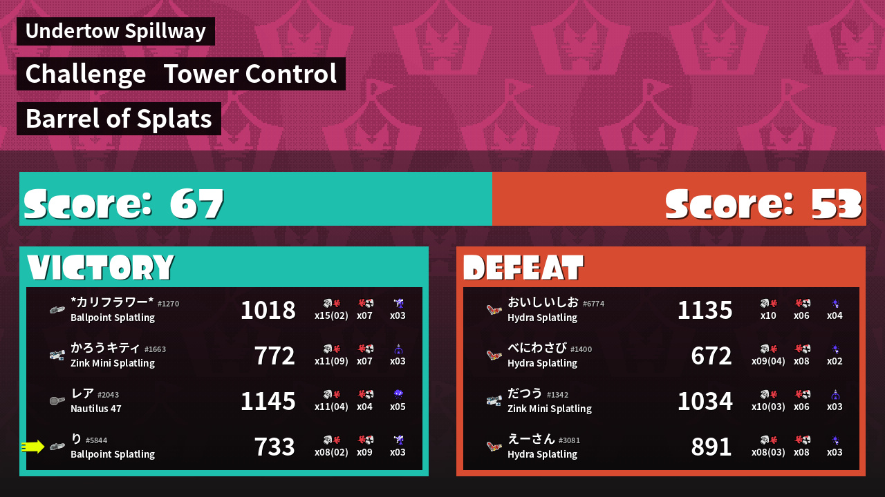 Challenge | Barrel of Splats Muster as much firepower as you can<br />in this battle of the splatlings! | ||||||||