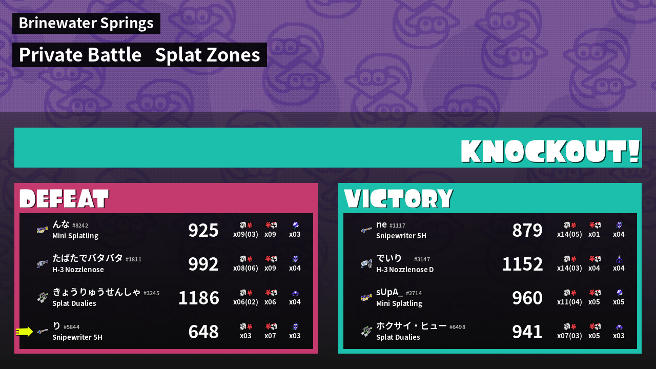 | Mode | Splat Zones - Private Battle | ||||||