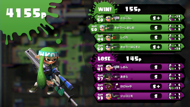 | Splattershot Jr. | 50 | S+ | 15 / 7 > | 2.14 | 68.2% | |