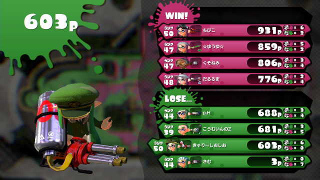 | Splattershot Pro | 44 | 688 | 3 / 4 < | 0.75 | 42.9% | |