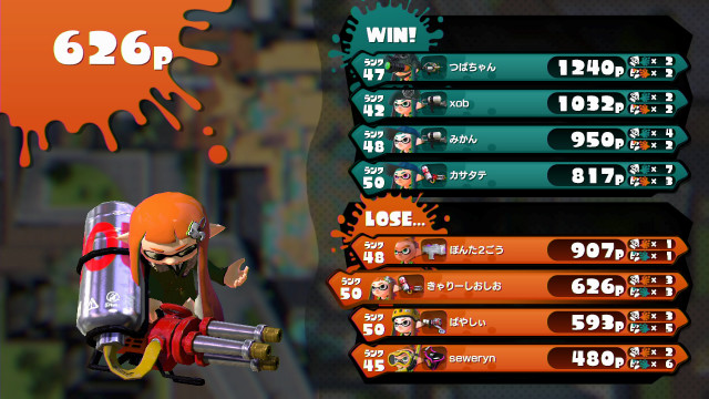 | Hydra Splatling | 50 | 626 | 3 / 3 = | 1.00 | 50.0% | |
