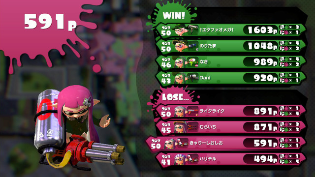 | Hydra Splatling | 50 | 591 | 1 / 1 = | 1.00 | 50.0% | |