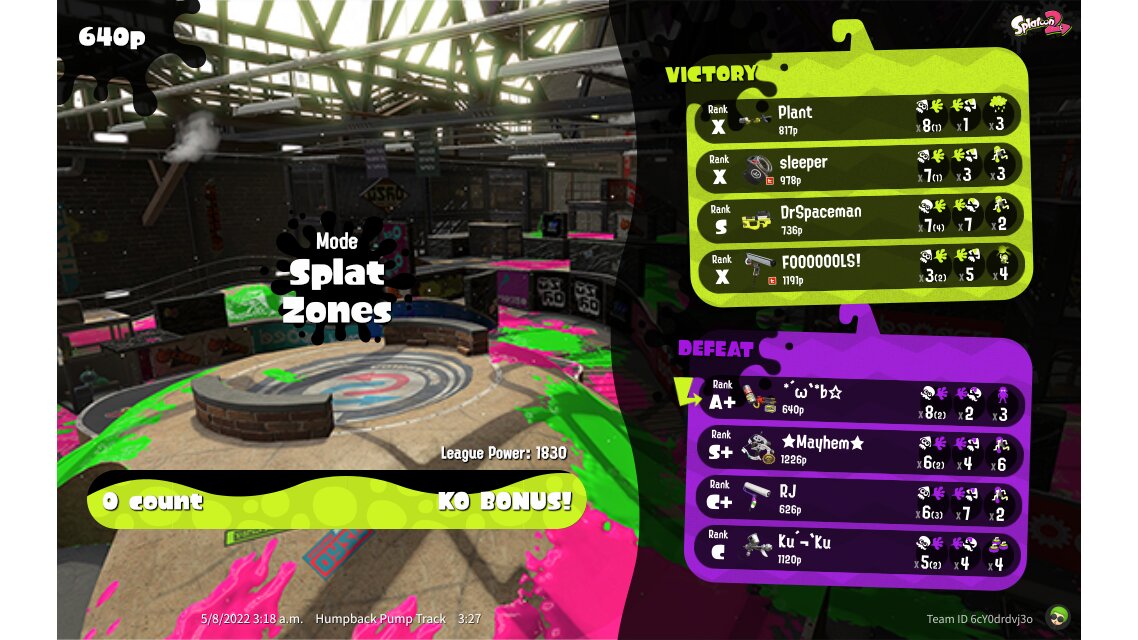 | Mode | Splat Zones - League Battle (Quad) | ||||||||||||||||||||||||||||||||||