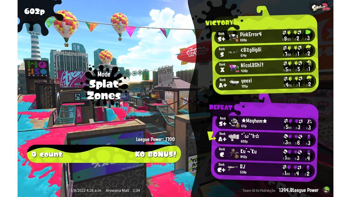 | Mode | Splat Zones - League Battle (Quad) | |||||||||||||||||||||||||||||||