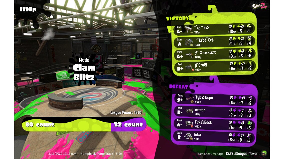 | Mode | Clam Blitz - League Battle (Twin) | |||||||||||||||||||||||||||||||||||||