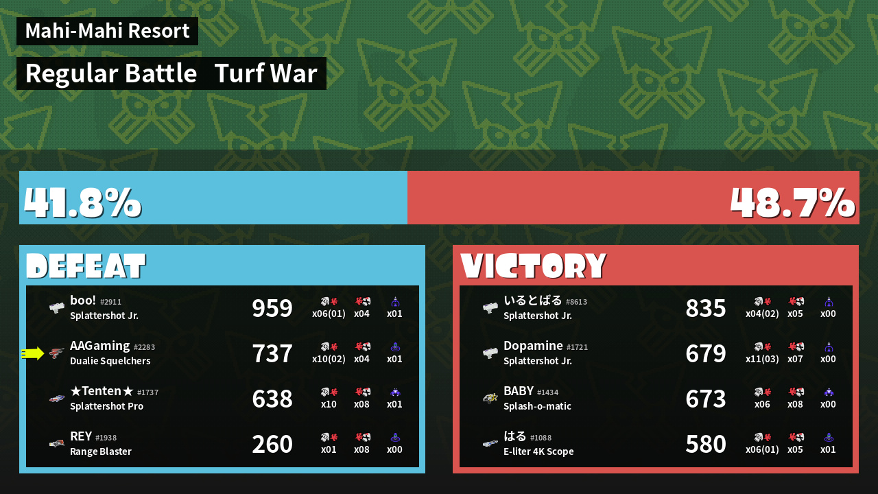 | Medals | #1 Overall Splatter #1 Enemy-Base Inker #1 Splat Assister | ||