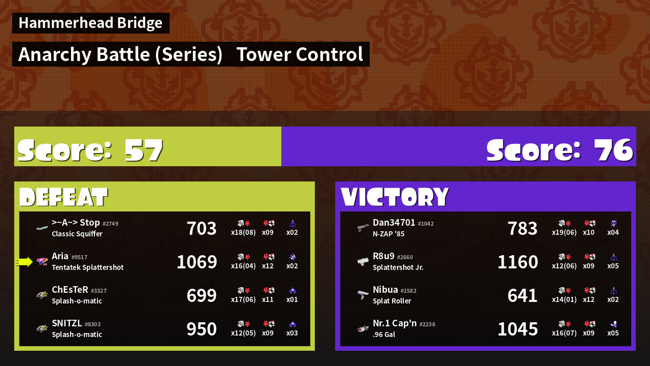 | Medals | #1 Turf Inker #1 Enemy Splatter #1 Damage Taker | ||