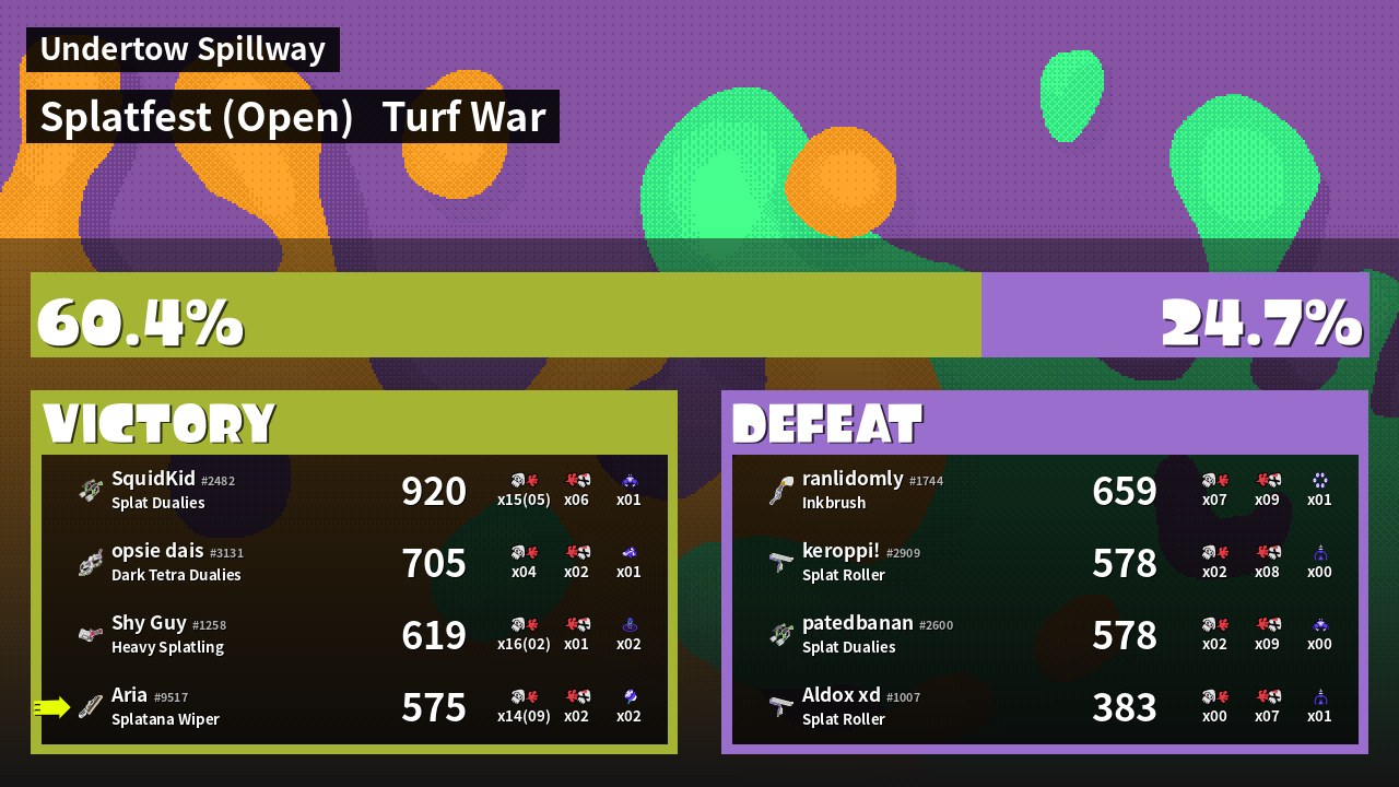| Medals | #1 Popular Target #1 Splat Assister #1 Damage Taker | ||