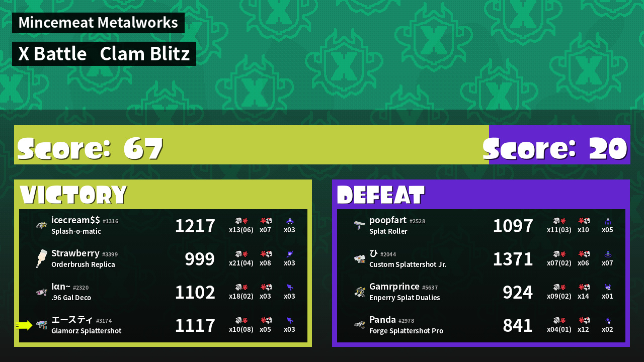 | Weapon | Glamorz Splattershot ( Burst Bomb / Kraken Royale) |