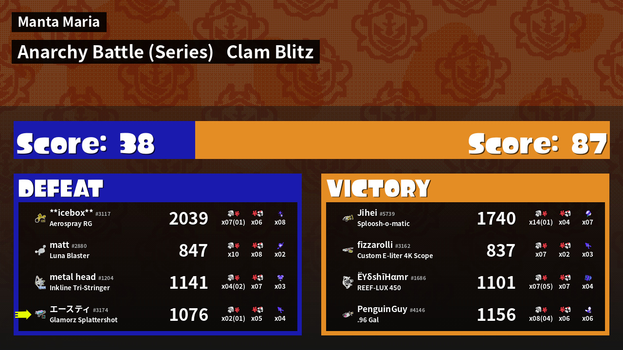 | Weapon | Glamorz Splattershot ( Burst Bomb / Kraken Royale) |