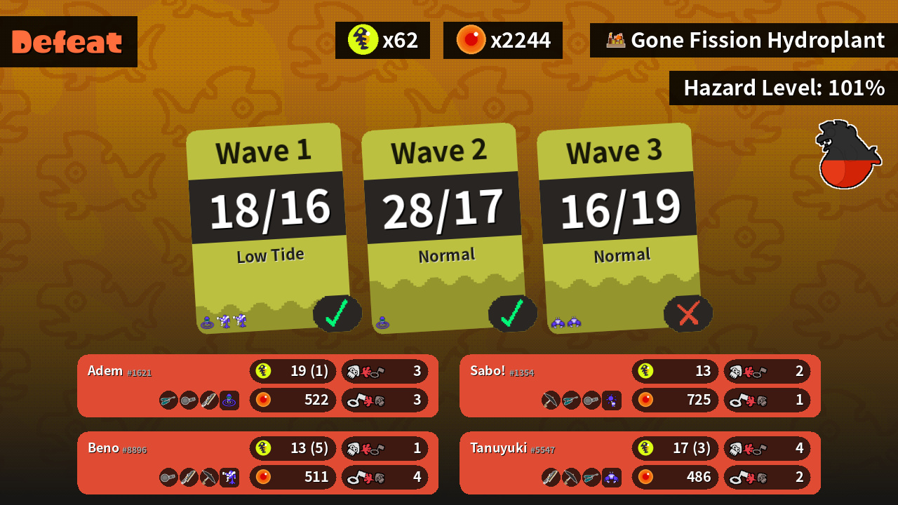 | Weapons | Jet Squelcher Nautilus 47 Splatana Wiper | Splatana Wiper Undercover Brella Jet Squelcher | Undercover Brella Jet Squelcher Nautilus 47 | Nautilus 47 Splatana Wiper Undercover Brella |