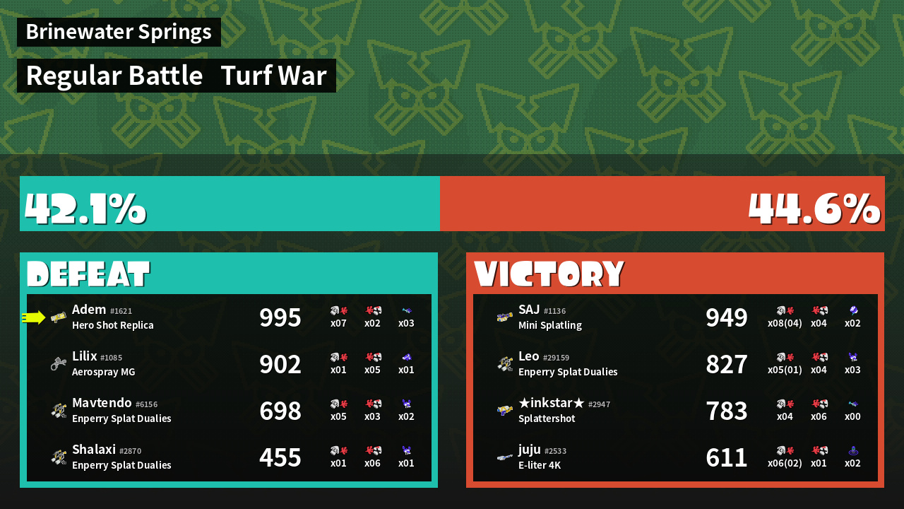 | Medals | #1 Overall Splatter #1 Turf Inker #1 Enemy-Base Inker | ||