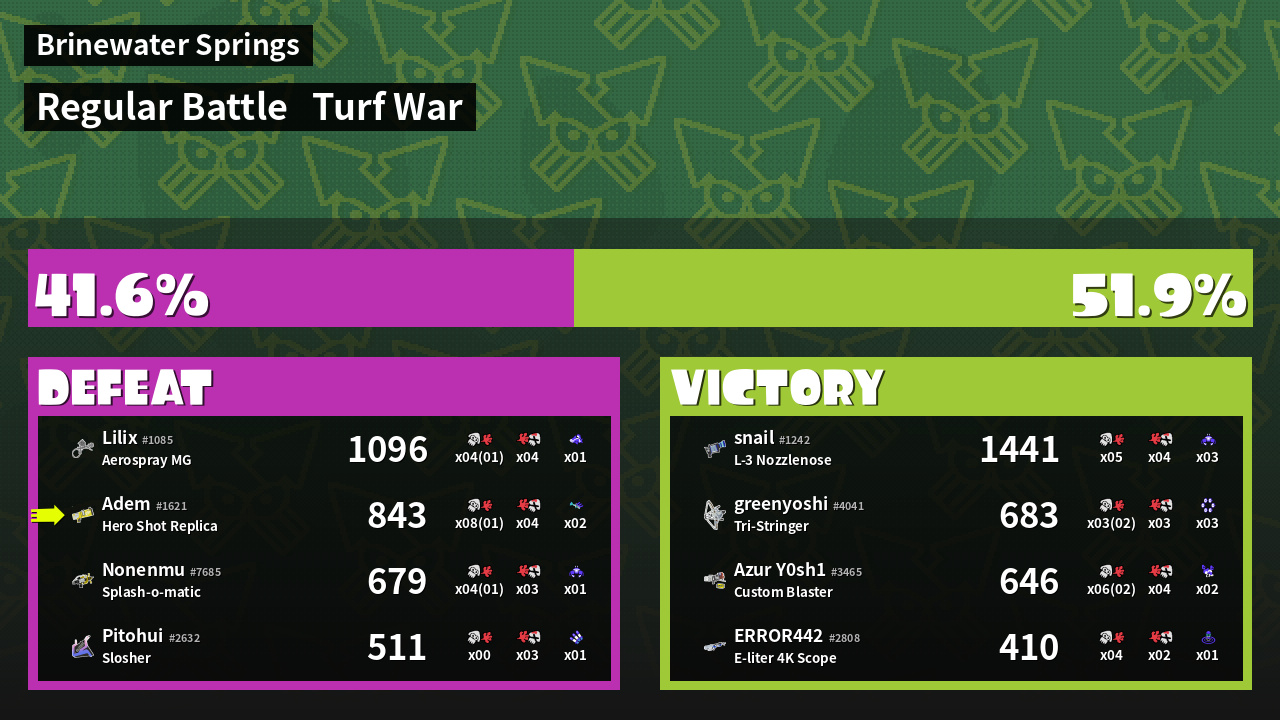 | Medals | #1 Overall Splatter #1 Enemy-Base Inker #1 Enemy Splatter | ||