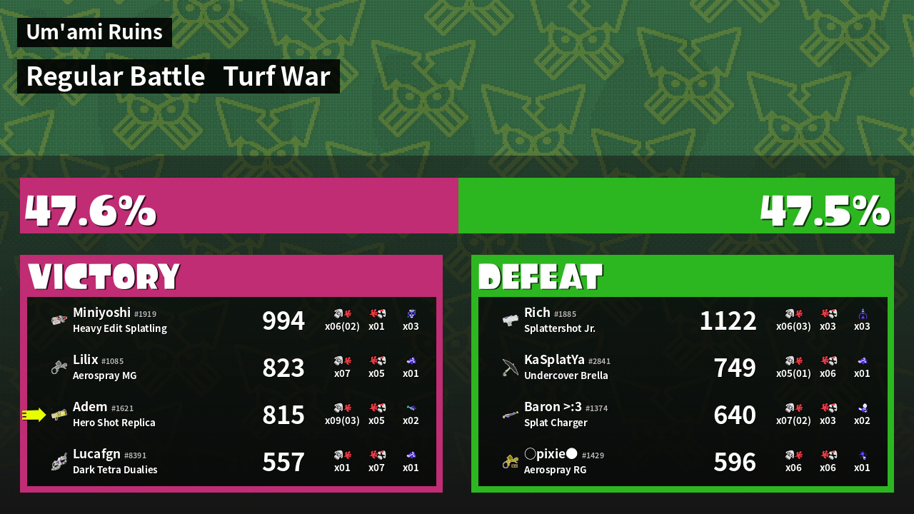 | Medals | #1 Overall Splatter #1 Popular Target #1 Enemy-Base Inker | ||