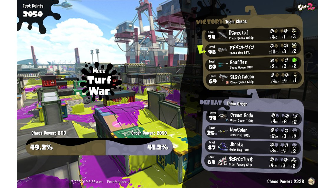 | Mode | Turf War - Splatfest (Pro) | ||||||||||||||||