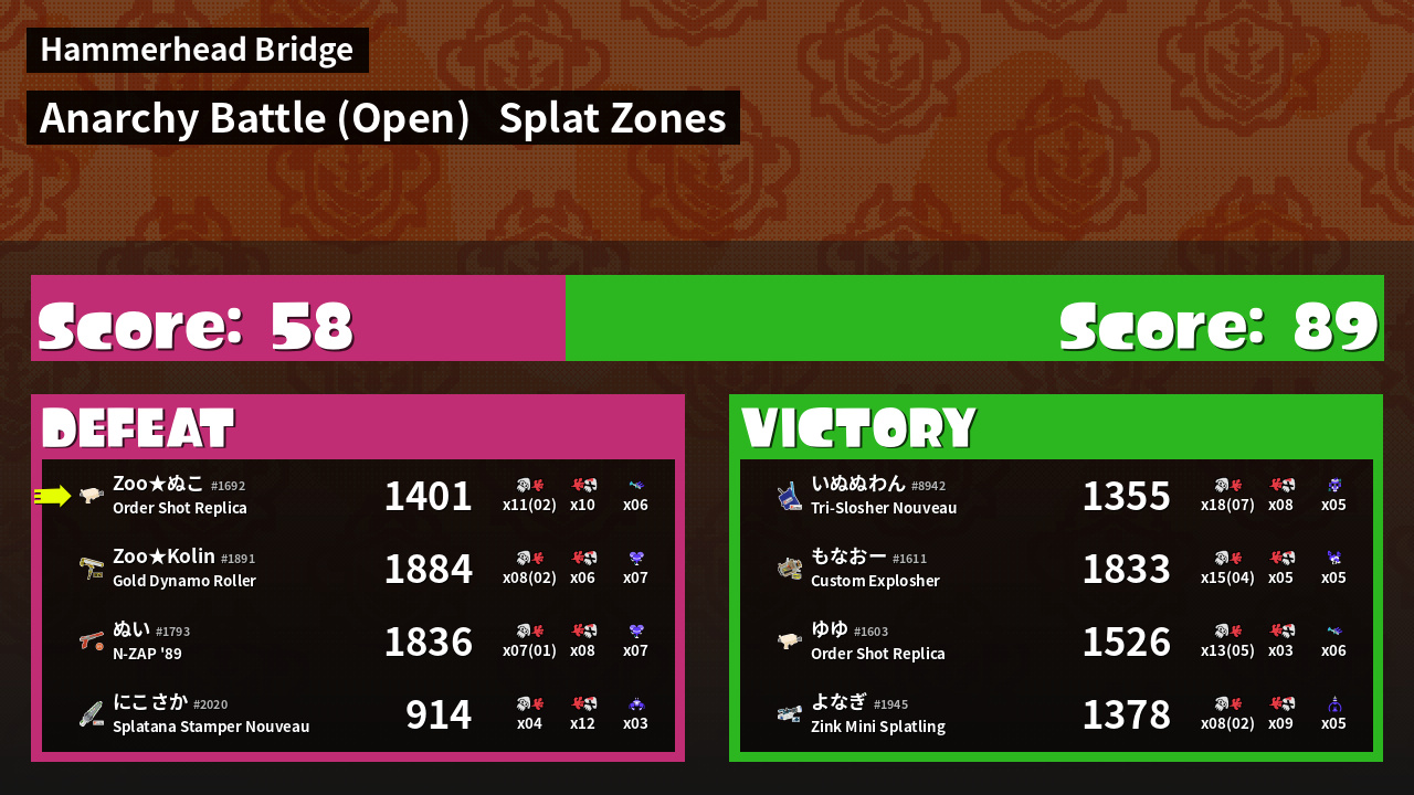 | Mode | Splat Zones - Anarchy Battle (Open) | ||
