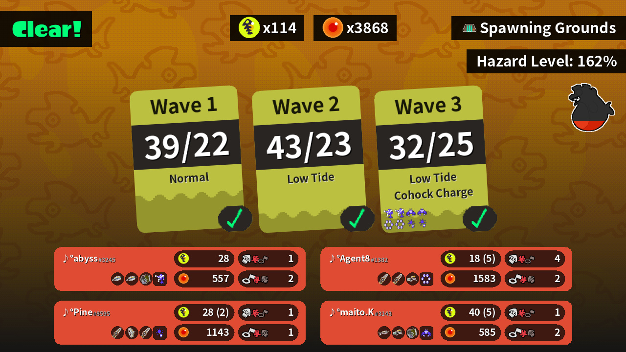 | Weapons | Grizzco Brella Grizzco Brella Grizzco Slosher | Grizzco Charger Grizzco Blaster Grizzco Slosher | Grizzco Splatana Grizzco Stringer Grizzco Splatana | Grizzco Splatana Grizzco Splatana Grizzco Blaster |