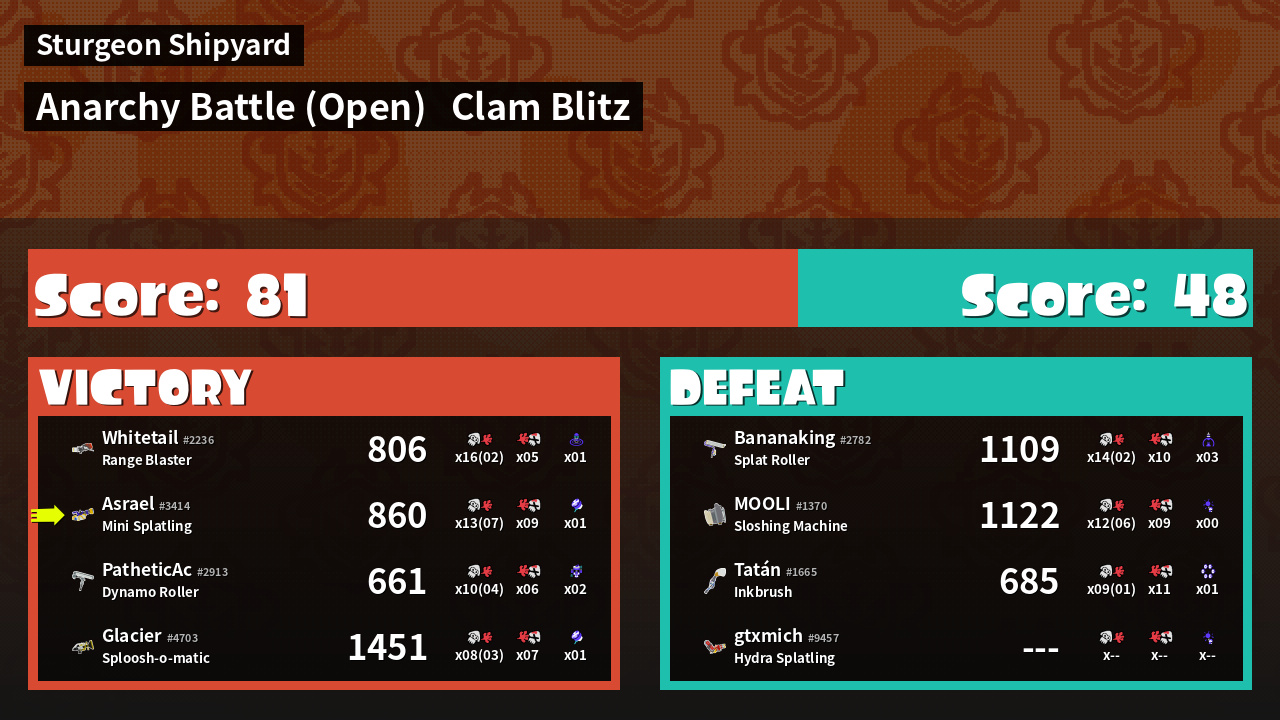 | Mode | Clam Blitz - Anarchy Battle (Open) | ||