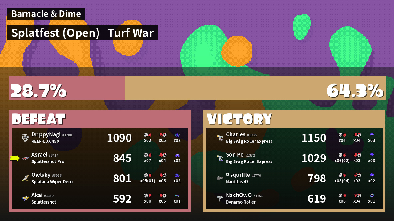 | Medals | #1 Overall Splatter #1 Popular Target #1 Enemy-Base Inker | ||