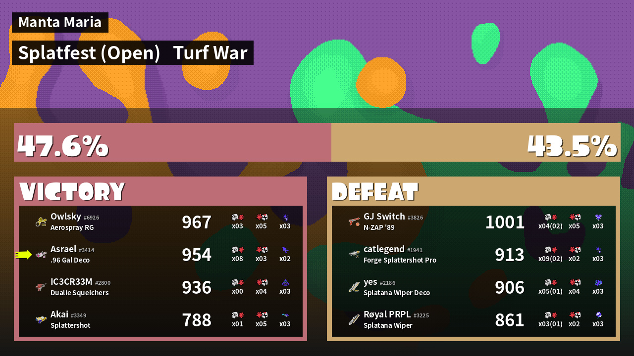 | Medals | #1 Overall Splatter #1 Popular Target #1 Enemy-Base Inker | ||