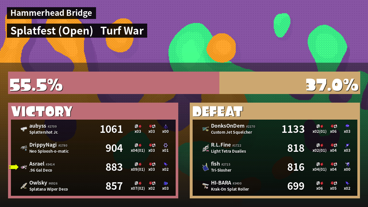| Medals | #1 Overall Splatter #1 Popular Target #1 Enemy-Base Inker | ||