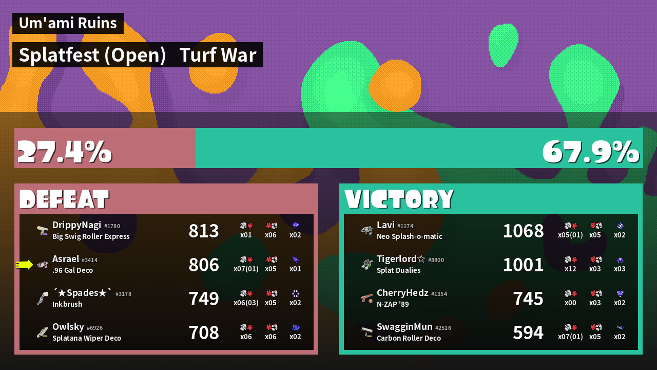 | Medals | #1 Overall Splatter #1 Enemy-Base Inker #1 Enemy Splatter | ||