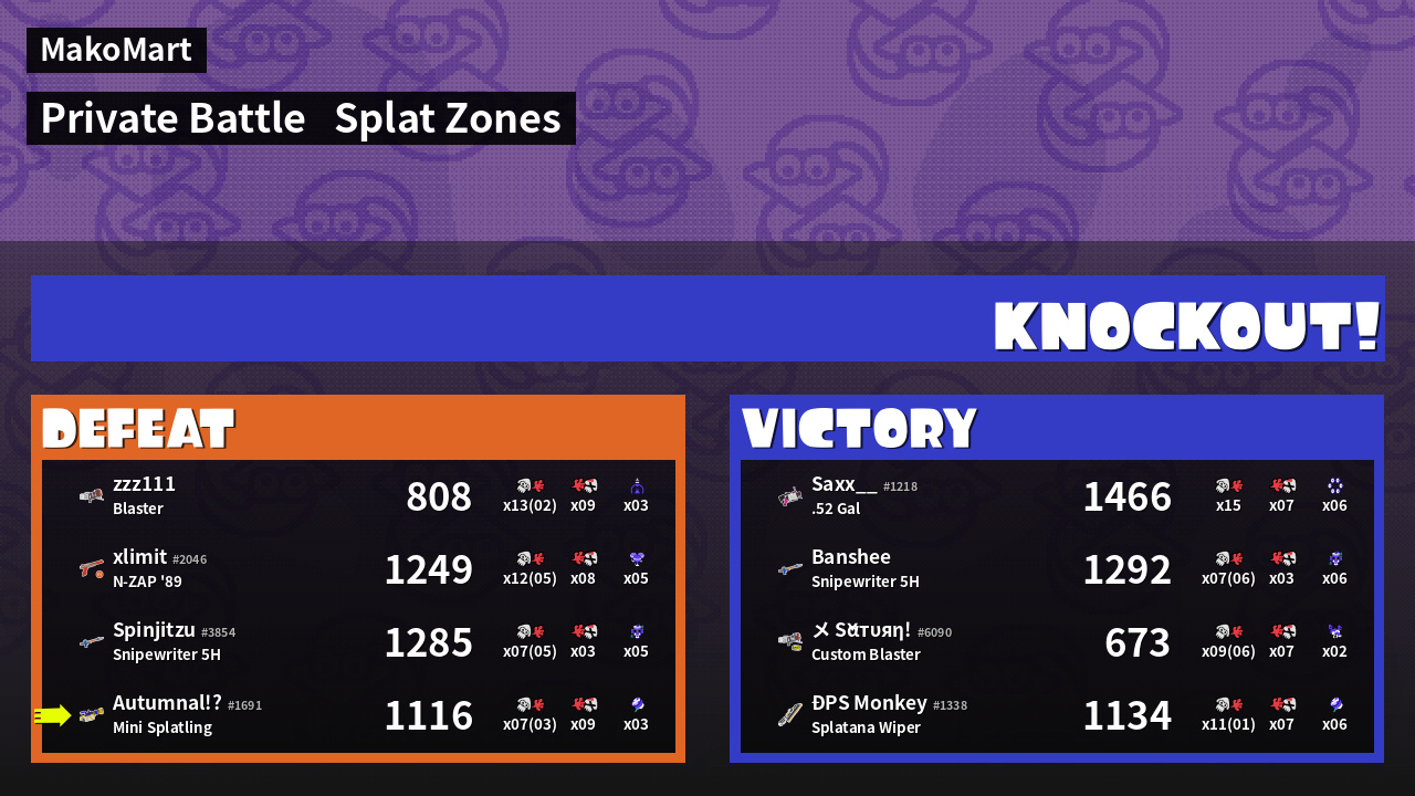 | Mode | Splat Zones - Private Battle | ||