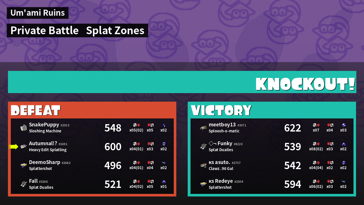 | Mode | Splat Zones - Private Battle | ||