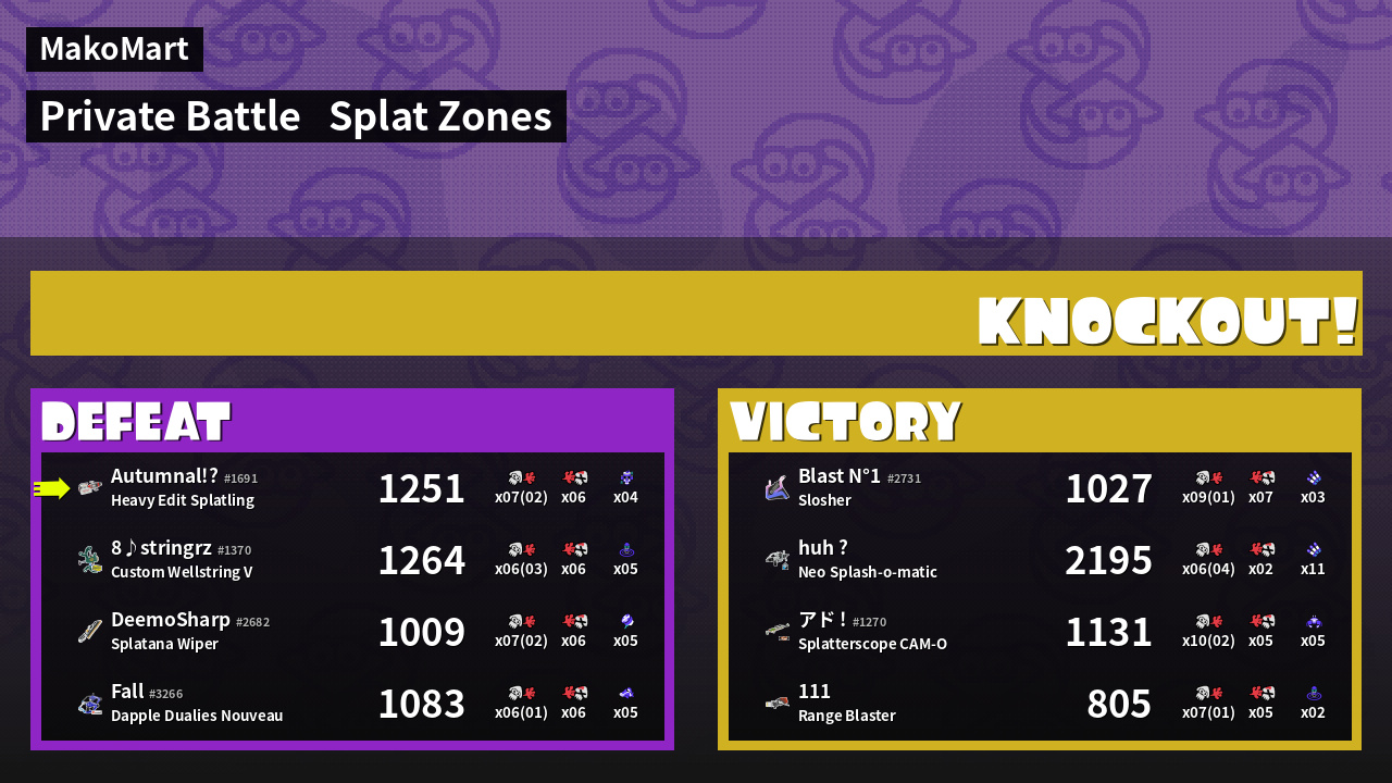 | Mode | Splat Zones - Private Battle | ||