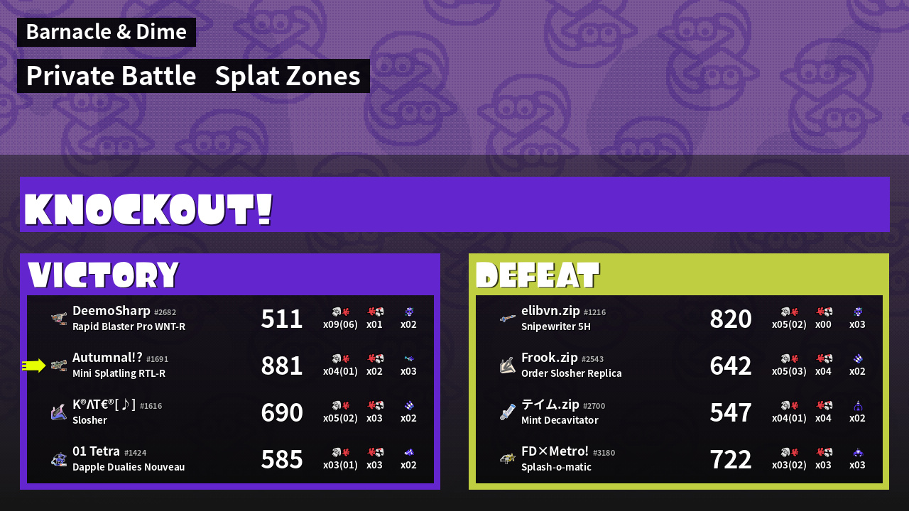 | Mode | Splat Zones - Private Battle | ||