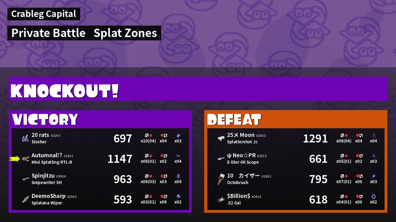 | Mode | Splat Zones - Private Battle | ||