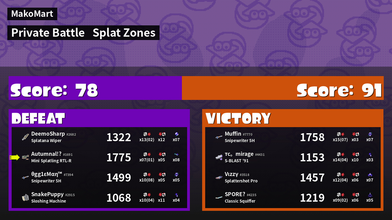 | Mode | Splat Zones - Private Battle | ||