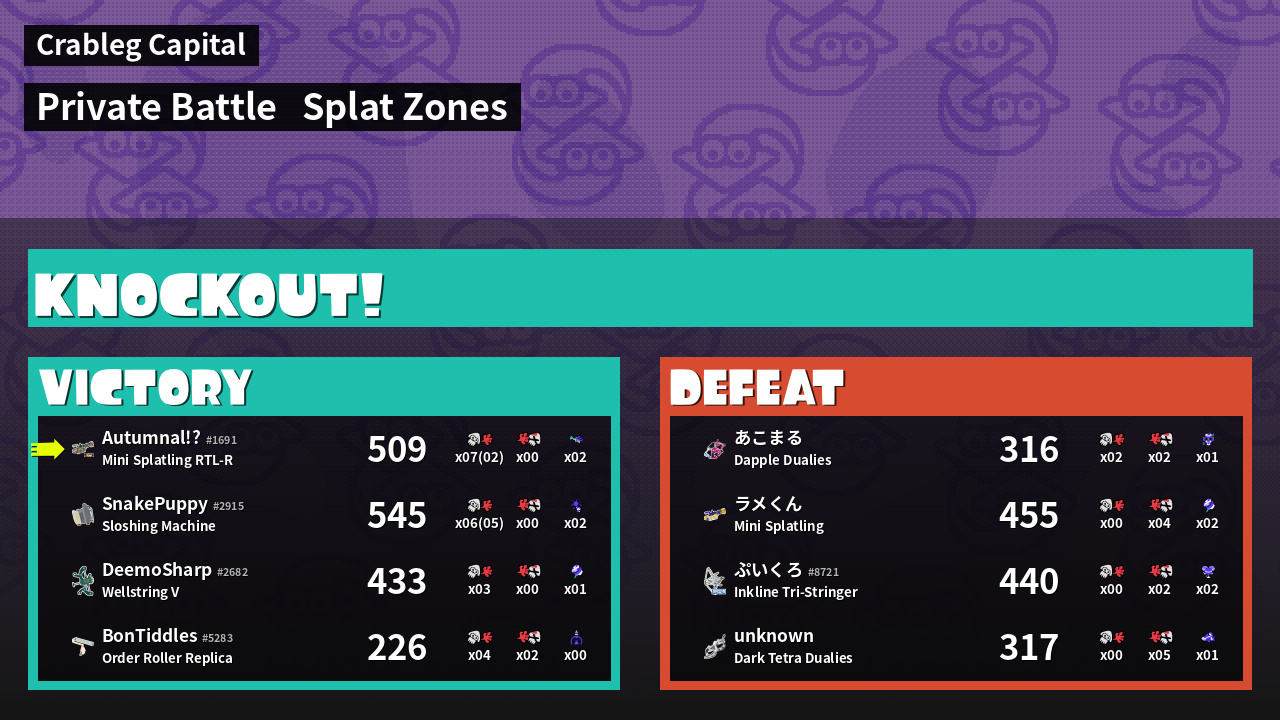 | Mode | Splat Zones - Private Battle | ||